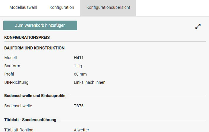 At the end you will have a configuration overview. You decide what is displayed in this overview. The configurator can be supplemented with a price list so that registered users can also see the price overview here.